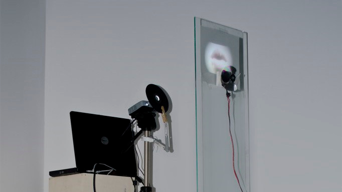 Loop de video sincronizado mediante microcontroladores con un ventilador incorporado a una bandeja de vidrio, sobre la que se retroproyecta.